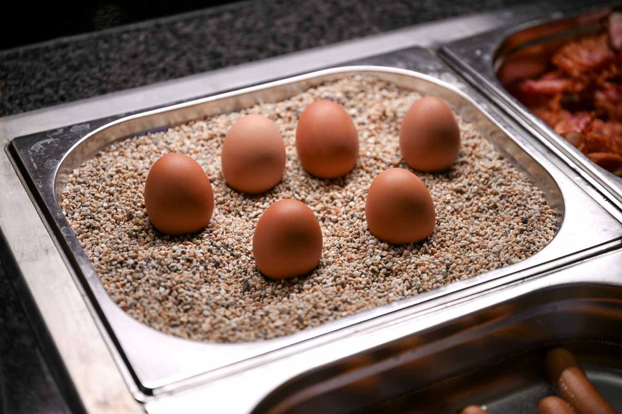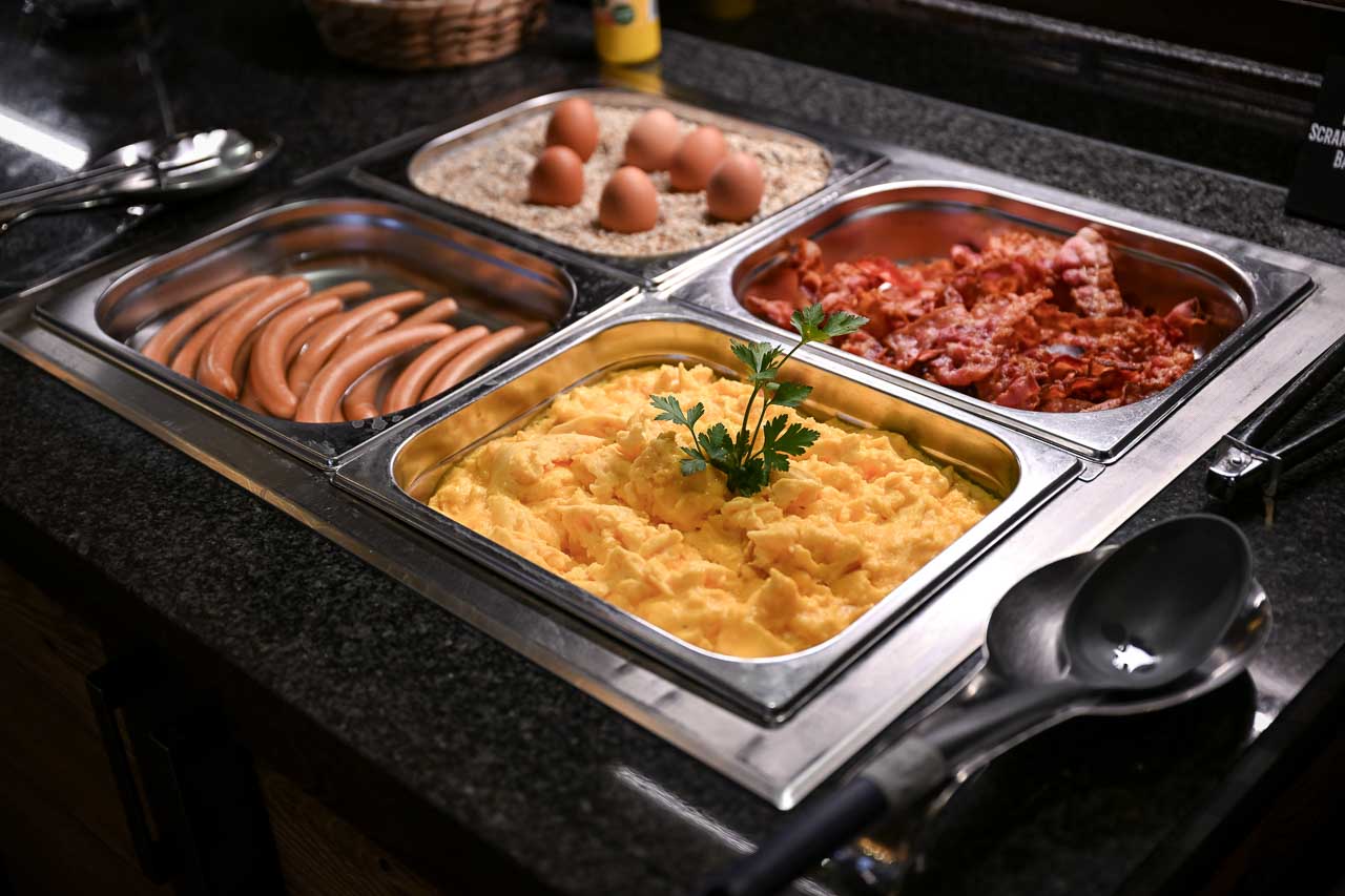 • Warme Speisen: Warme Frühstücksklassiker wie Rührei, Speck und Würstchen dürfen nicht fehlen, ebenso wie wechselnde warme Beilagen.