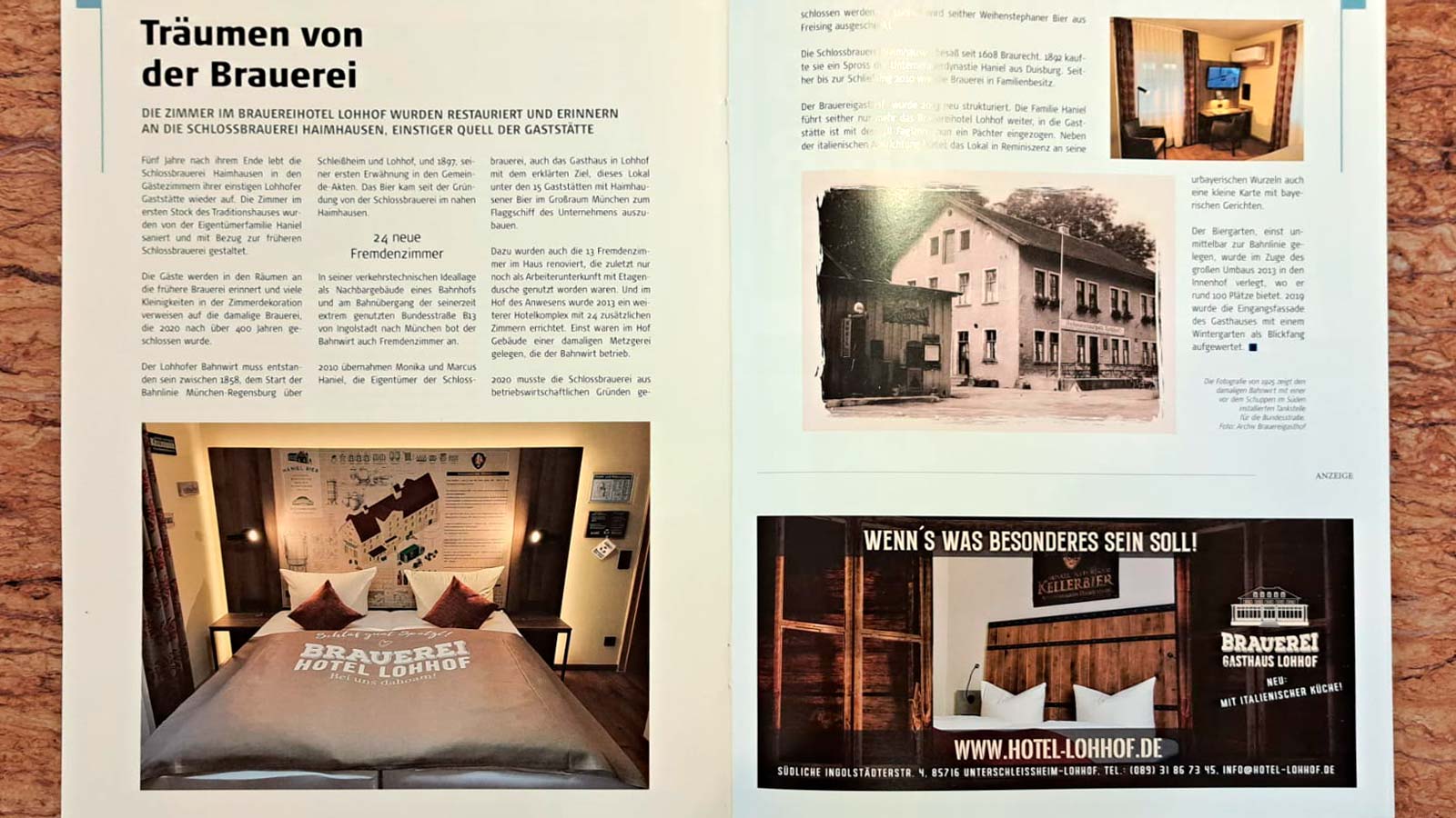 Der Tourismus Schleißheim e.V. hat in seiner neuesten Ausgabe im Schleißheimer Magazin Nr. 42 einen schönen Artikel über unser Hotel bzw. der Sanierung der Zimmer im Altbau 1. Stock und deren Historie veröffentlich. Erinnerungen an die Schlossbrauerei Haimhausen und die Entwicklung des Brauerei Gasthauses Lohhof werden u.a. erläutert. Viel Spaß beim Lesen.